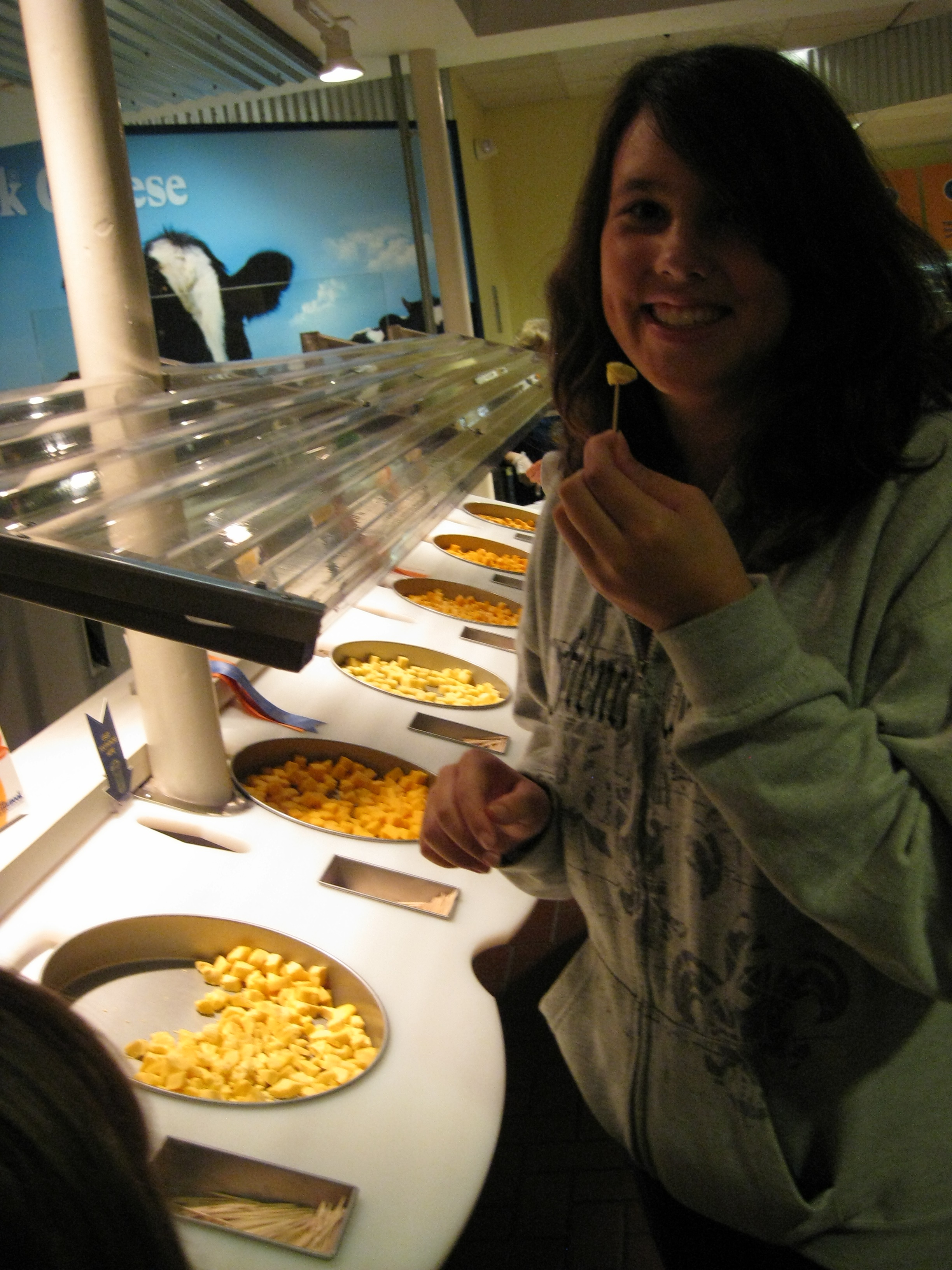 At the end of the tour we all got a chance to try out some cheese. One thing we were excited to try was what they call Squeaky Cheese. It’s just cheese curd with a fun name….it actually squeaks when you chew it! As you can see, Sy was very anxious to be a taste tester 🙂