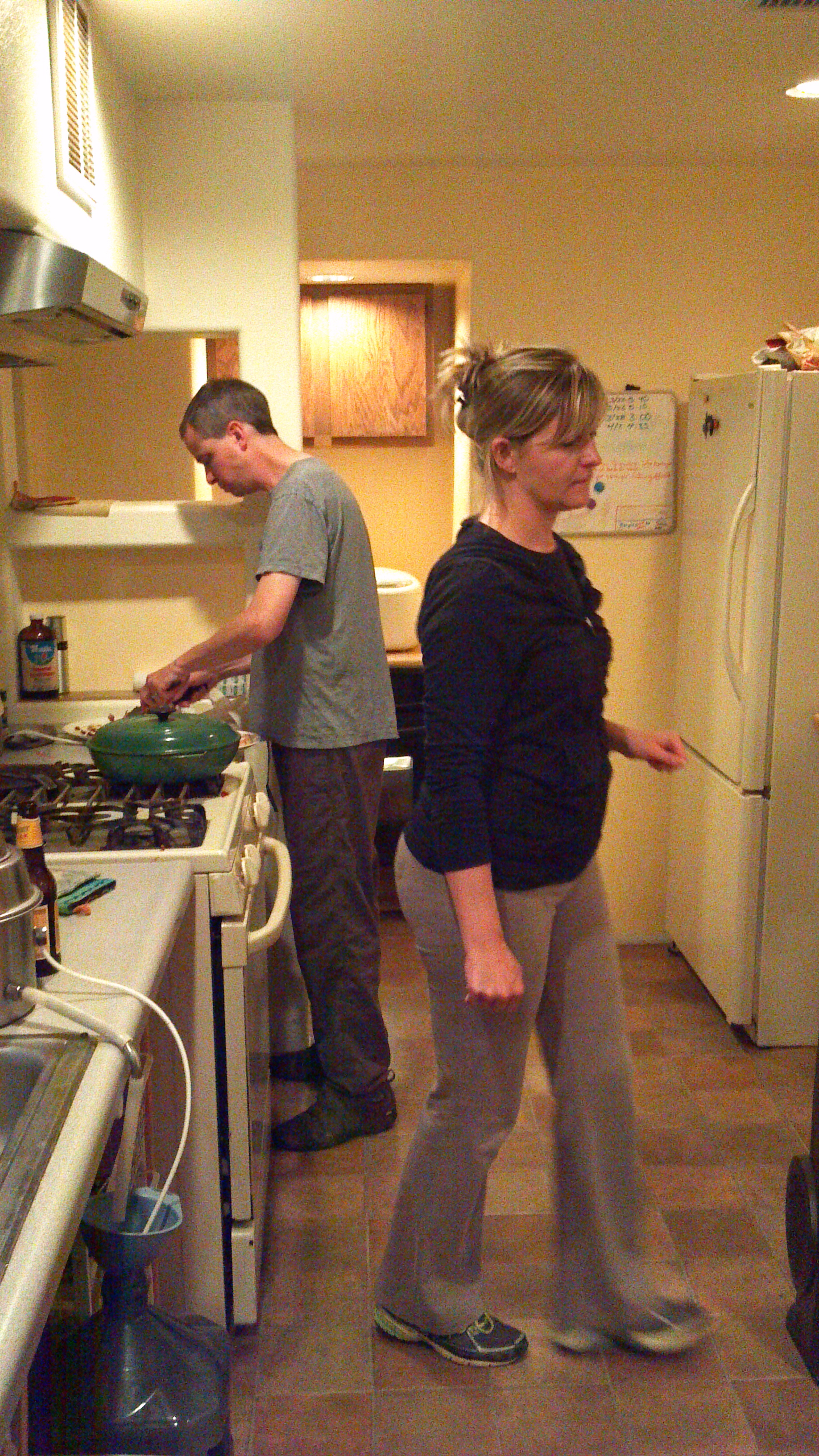 And then headed over to Rainbow Hearth.  John and Puja jumped in and made a wonderful birthday dinner for her.  John made an amazing sun dried tomato and goat cheese stuffed chicken, and Puja whipped up some mashed cauliflower along with a lovely garden salad from Mariah’s personal stock of sprouts.  Here’s John and Puja in the kitchen!