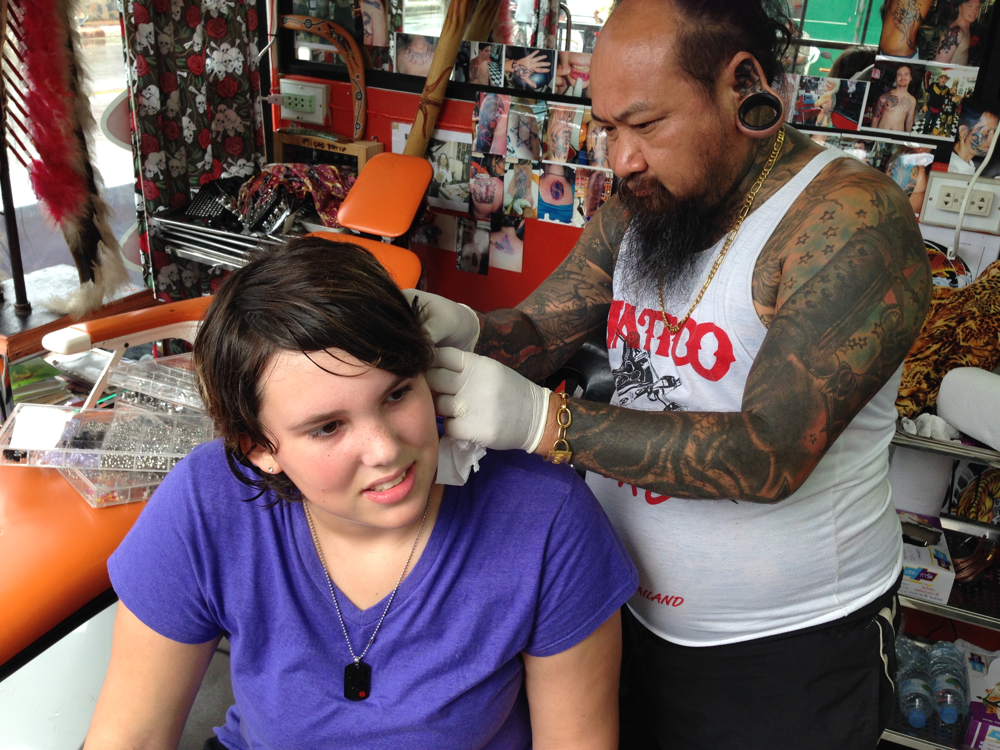 However, in our excitement we made a tactical error.  We went to a Claire like location to get the piercing.  We should have just gone to a tattoo parlor.  I think piercings should be done by trained professionals, not minimum wage bubble gum chewing teens.  So, a week after we had the piercing done, we had a slight ear infection.  I think this was due to swimming in the ocean and improper cleaning….and we decided to visit a well reviewed tattoo artist in Patong by the name of Micro Tattoo.