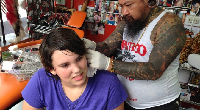 So recently Grace asked if she could get another ear piercing.  Carl and I had discussed some time ago how far and how fast we would let self mutilation go….it’s a big subject considering we both like self expression as well as tattoos (ahem…I have three).  However, age and maturity are both LARGE factors in making these kinds of decisions.  I am not going to air why I think the way I do, or defend my viewpoint.  I understand that we all have different ideas about what is acceptable and allowable.  I tend to be a bit reserved in my viewpoint on personal freedom for my underage children, and I have my reasons which my husband agrees with.  That being said, I was the one to convince Carl that an ear cartilage piercing for our 13 year old daughter was acceptable to me.  Grace is a very mature 13 year old.  Not only does she look much older, but her actions portray the very best qualities that we have tried to instill in our children.  She is very responsible, self motivated and doesn’t really ask for much.  By the time she gets around to asking our permission for something, it means that she has been thinking about it for some time.  She is getting to the point where she realizes that there is a great big life out there for her, and her decisions at this point will affect the opportunities presented to her in the future.
