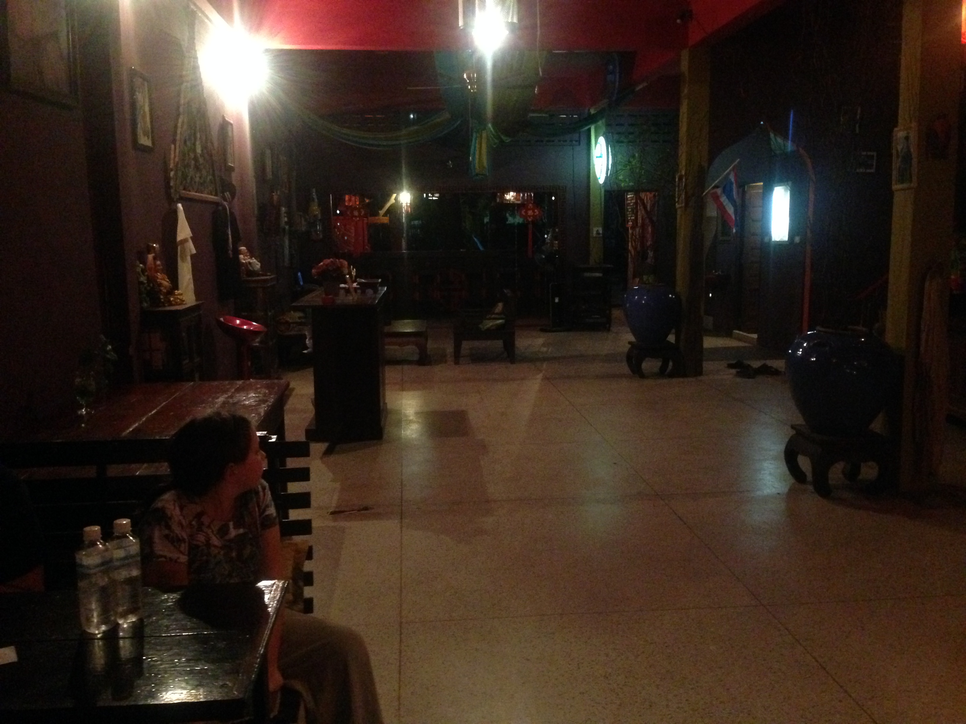 It was pretty empty when we got there. But it was 7 pm and we were hungry so we headed up to our room to shower and see about getting some dinner. The room was clean and big and it shared a set of bathrooms with two other rooms on the same floor. However that night something was wrong with the running water so we had to take a bucket bath! That was fun, the water was cool, but we got all the travel grime off which was the important part! Then I headed downstairs to find out where we could get some dinner and was happy to find that there was a local pizza guy that would deliver! The kids and I devoured three pizzas and decided to hit the hay. We had a long day and were ready to get some shut eye. However, let’s just say that the mattress wasn’t heaven sent. We ended up napping on and off around the springs 😦 I have to say that the mattress was really the only negative thing. I didn’t mind the scoop shower method and the atmosphere was vibrantly hippy with a lot of arts and crafts to check out. There were a lot of places to sit down in the common area and we really enjoyed hanging out the next morning and chatting with Cheer and some bicycling tourists from South America. Cheer used to be an accomplished rock climber and gave us some tips for when we came to Krabi.