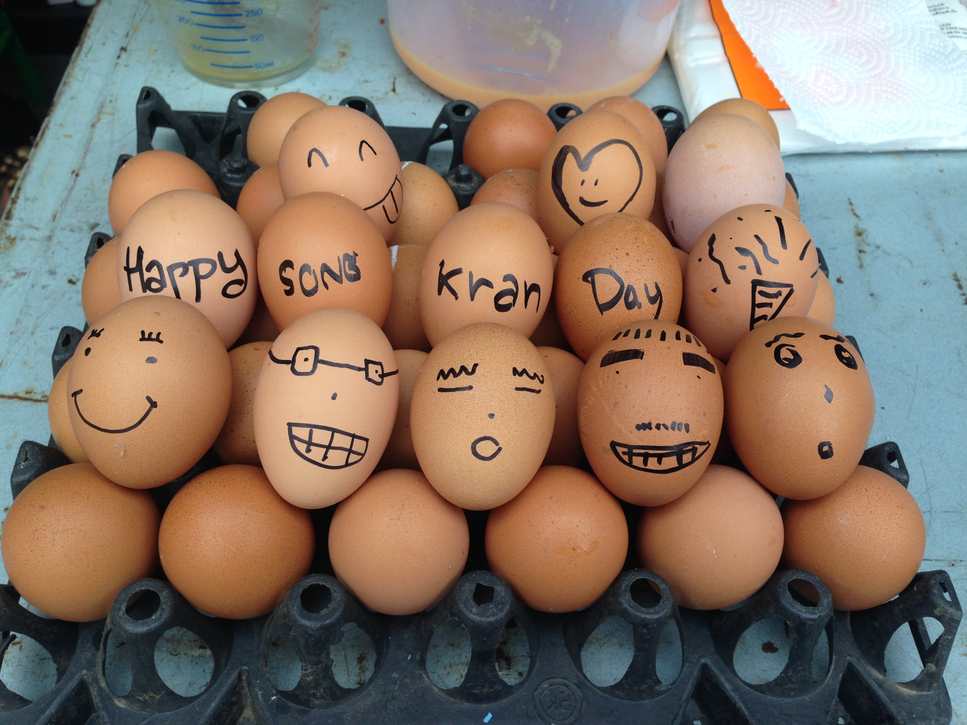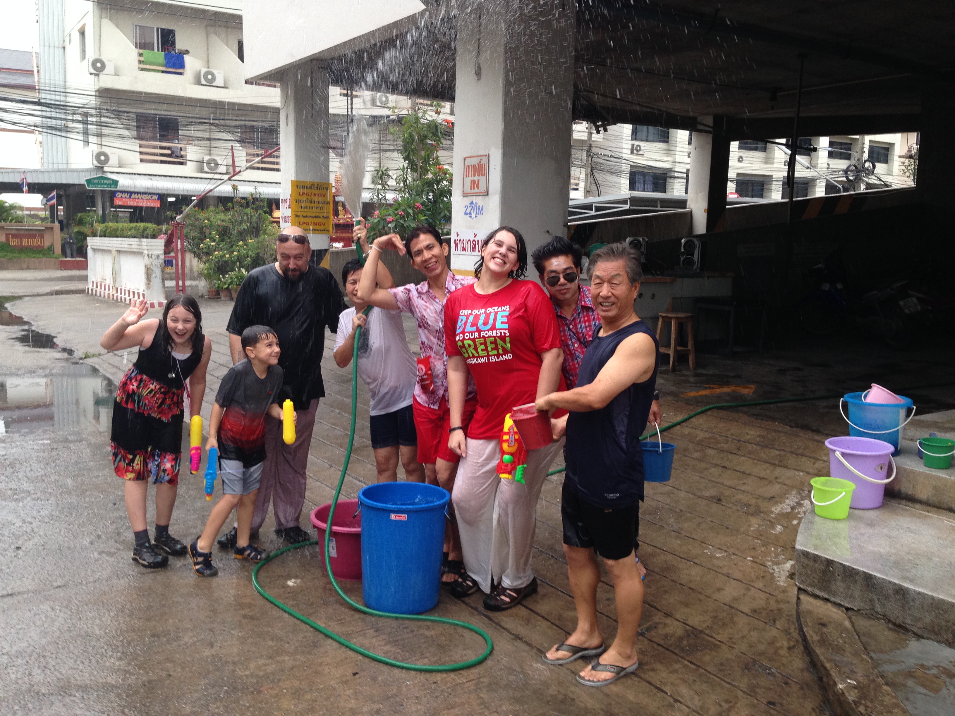 Songkran is the Thai New Year and is now considered a country wide water fight.  Of course, it wasn’t always about water guns and ice cold buckets of  “น้ำ”  being tossed around.  Songkran is traditionally a time to honor elders and monks.  The festival is about cleansing and renewal.  Upon cleansing the Buddha statues, the water was caught and then used to bestow blessings of good fortune on the country’s elders by pouring the ”blessed” water over the shoulders of the people.  This eventually morphed into the water festival is it now primarily because April is the hottest month of the year as well as the ushering in of the rainy season.  Another way the locals ”bless” people is by smearing wet talc powder upon their cheeks.  Grace and I were blessed in this way on the final day of Songkran!