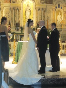 I tried to get a good picture of Lauren and her Dad walking down the aisle…but I was using Grace’s camera and wasn’t very well versed in how to use it so I flubbed it up.  And I have to say that Lauren looked like a princess from a fairytale.  She was absolutely stunning!  (but I knew she would be!).  As far as pictures went, I had better luck taking a few of Lauren and Jorge at the alter.