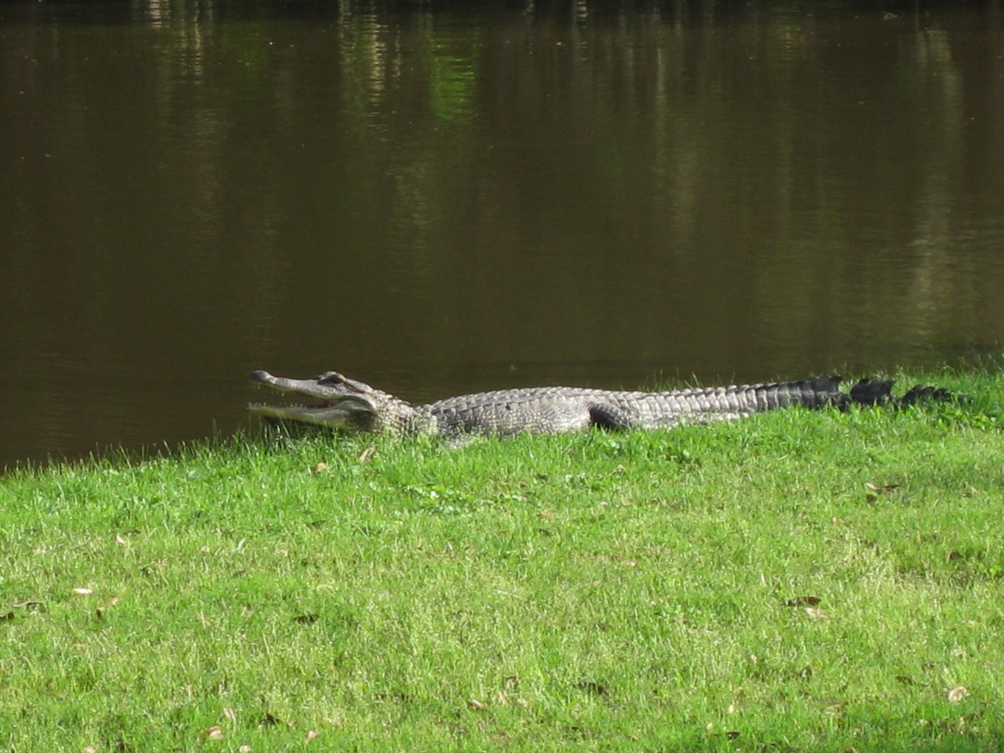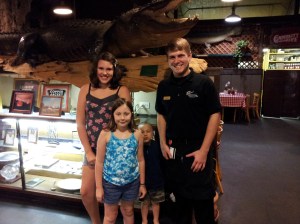 The ambiance of the restaurant was great too.  They had a live band which wasn’t too loud…it added just the right amount of background for our evening.  And the decor was extremely fascinating, especially for a four year old!  Lots of gators and other local wildlife 🙂  Here is a pic of a rather large stuffed gator, and our wonderful server who is a self proclaimed home chef extraordinaire, almost college grad, and a cutie with a great personality 🙂