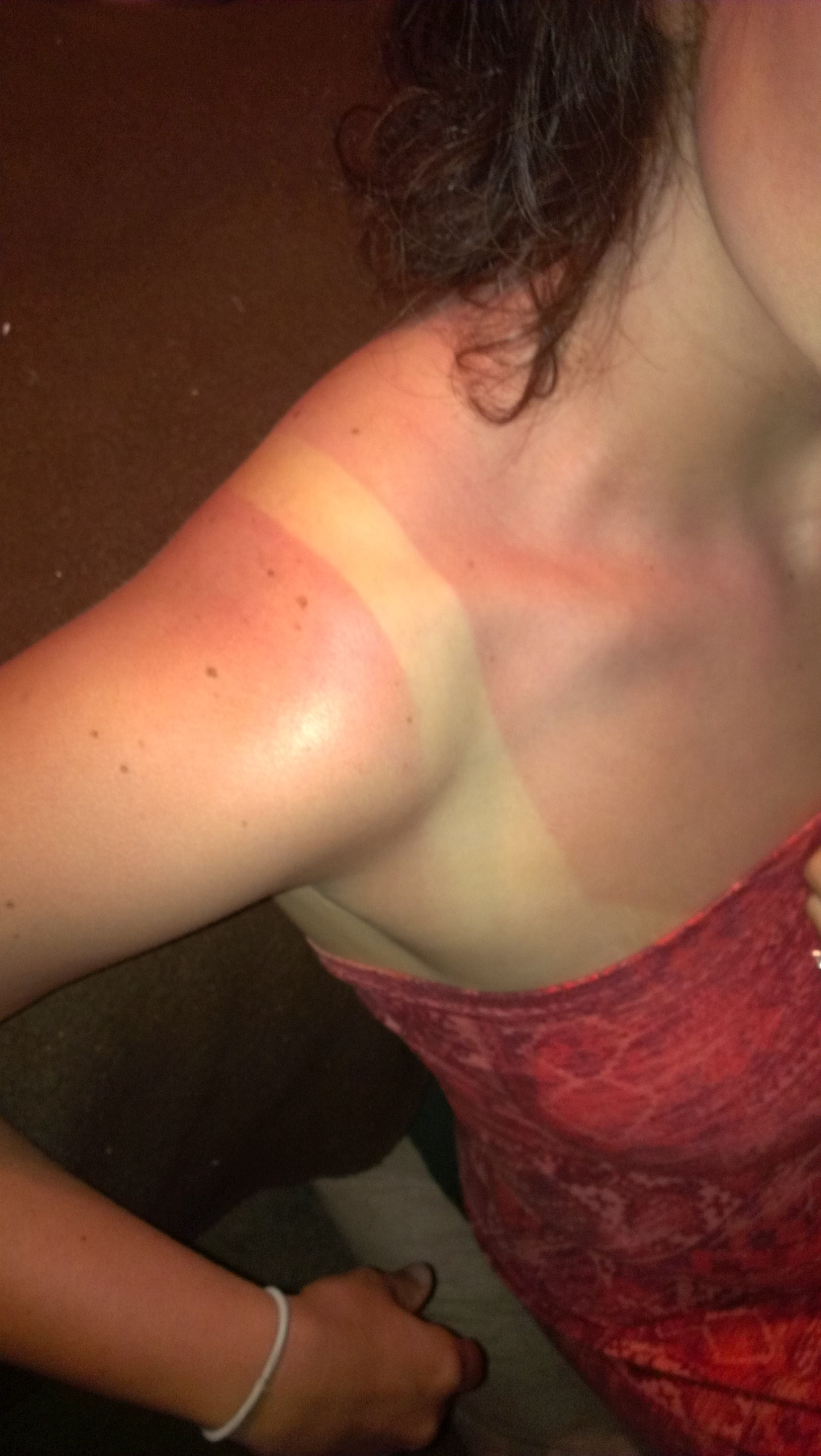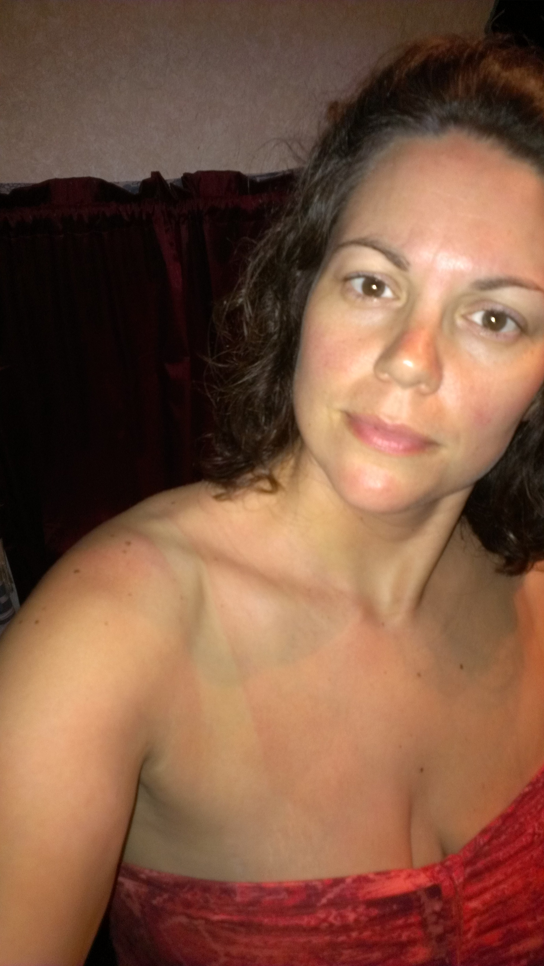 So, I sat on the floor with my mixing bowl full of tepid tea bags, with a towel around my top so I wouldn’t stain my clothes and proceeded to dip and pat said tea bags over my shoulders while we watched a movie. After about two hours of dipping and dabbing, I smelled like a grape! I didn’t rinse it off and then hit the sheets…..and this is what I looked like the next day….