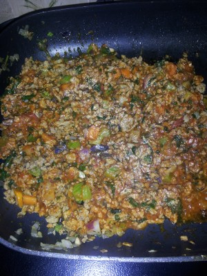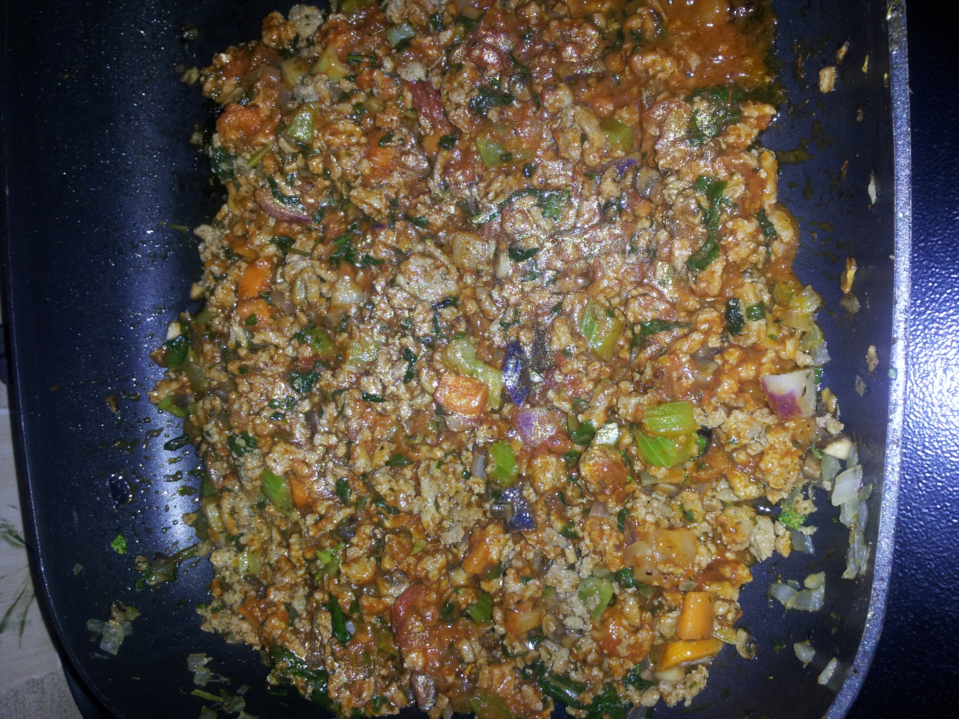 First, heat up a skillet and toss in your ground meat, chopped veggies and some herbs/spices.  By the time the meat is cooked the veggies are soft enough to let the oven do the rest of the cooking.  Once the meat is cooked then add some sauce…however much you want…I tend to go for the ”sloppy joe” consistency!