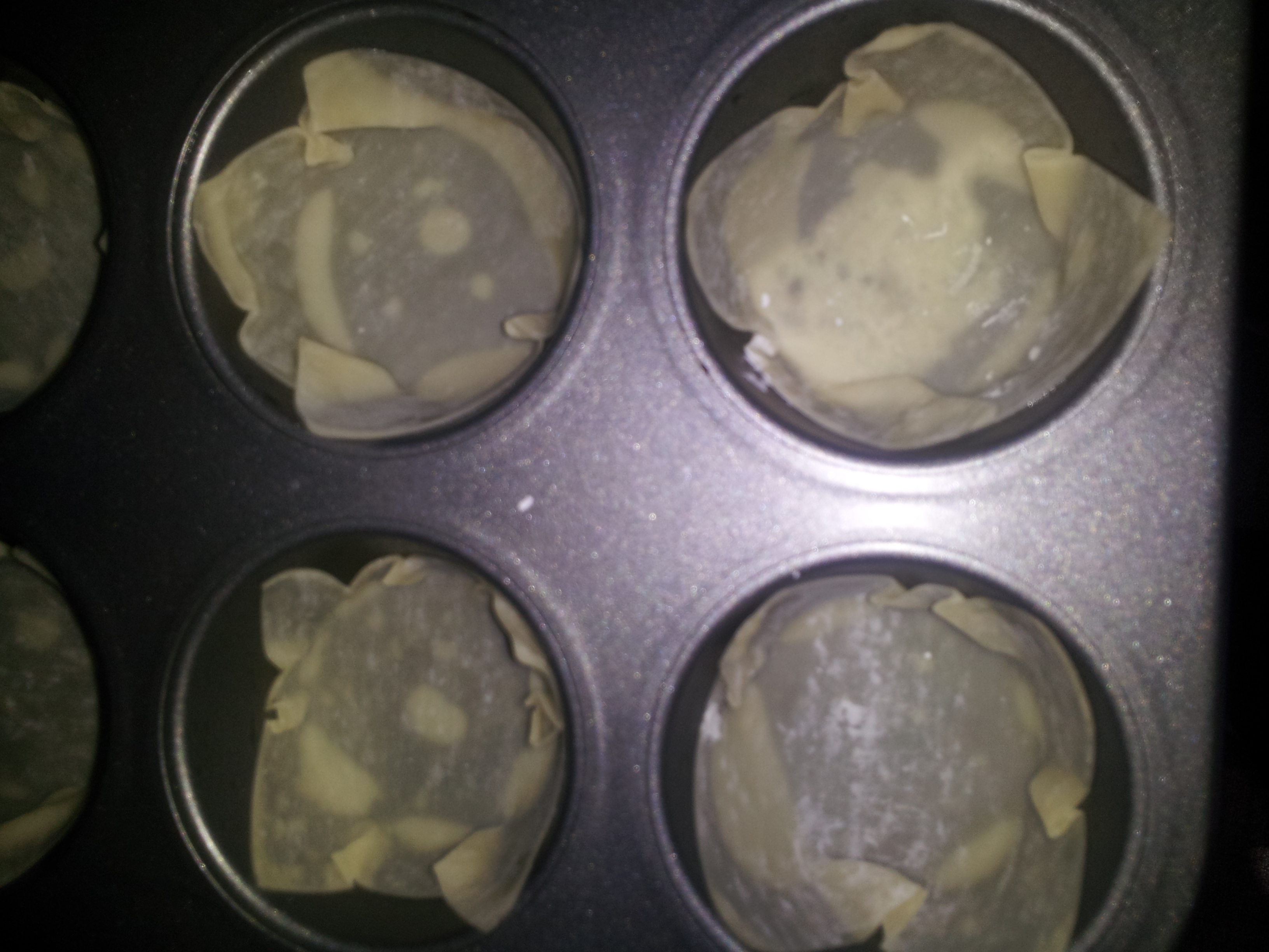 Take your wonton wrappers and push one into each cupcake hole making sure to press it into the pan to form to the cupcake shape like so: