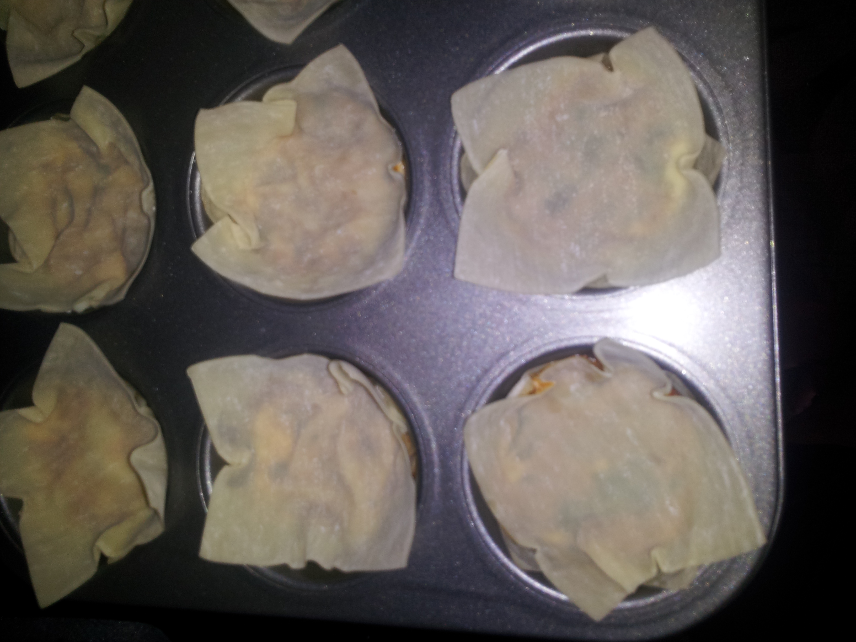 If you’re like me you like cheese….so at this point I sprinkled on some mozzarella and then layered on another wonton wrapper.  With this one you want to smush it down so the bottom ingredients are firmly filling out the cup.