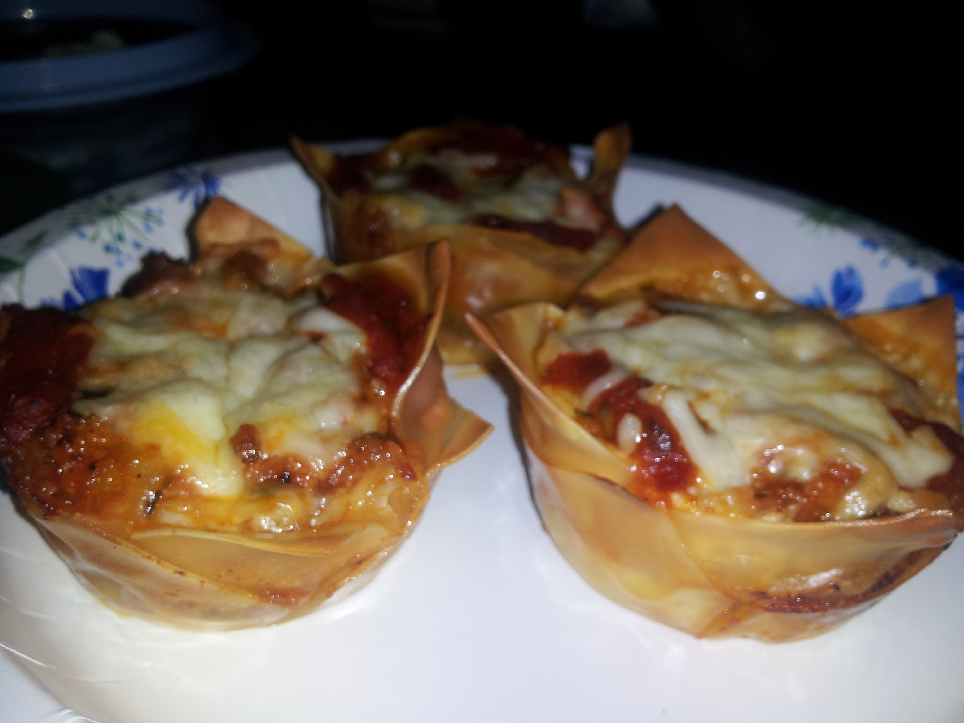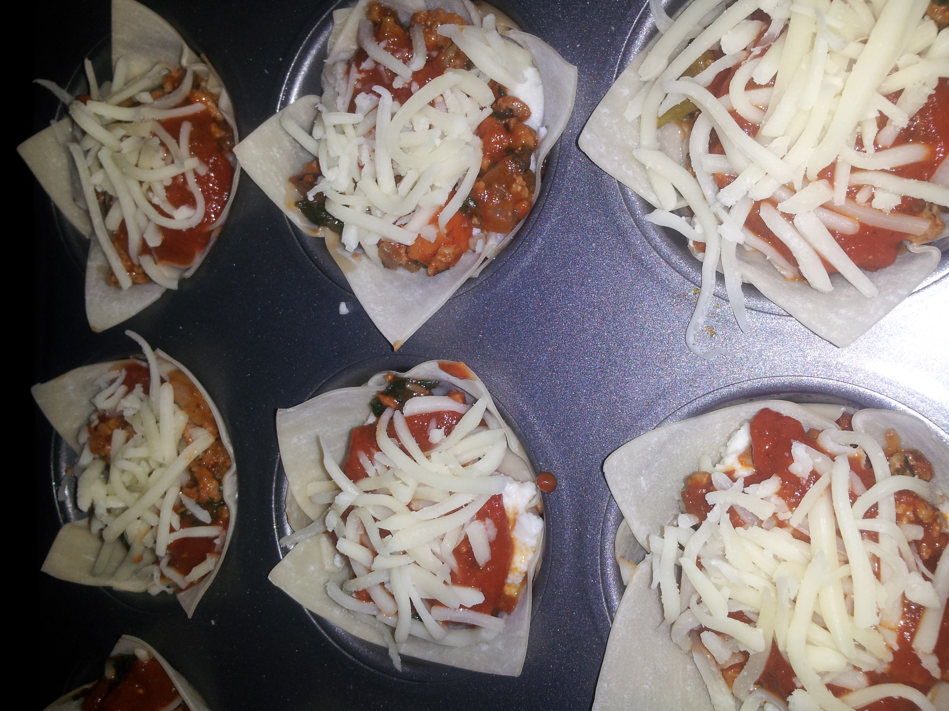 These babies are ready for the oven!  Pop them into a preheated (350) oven and bake them for about 12 minutes or until the tops are starting to brown.  Pull them out and let them sit for a few minutes.  As they sit the bottoms will firm up creating an easy to eat lasagna cupcake!  Be careful though…the insides stay hot for quite a while!
