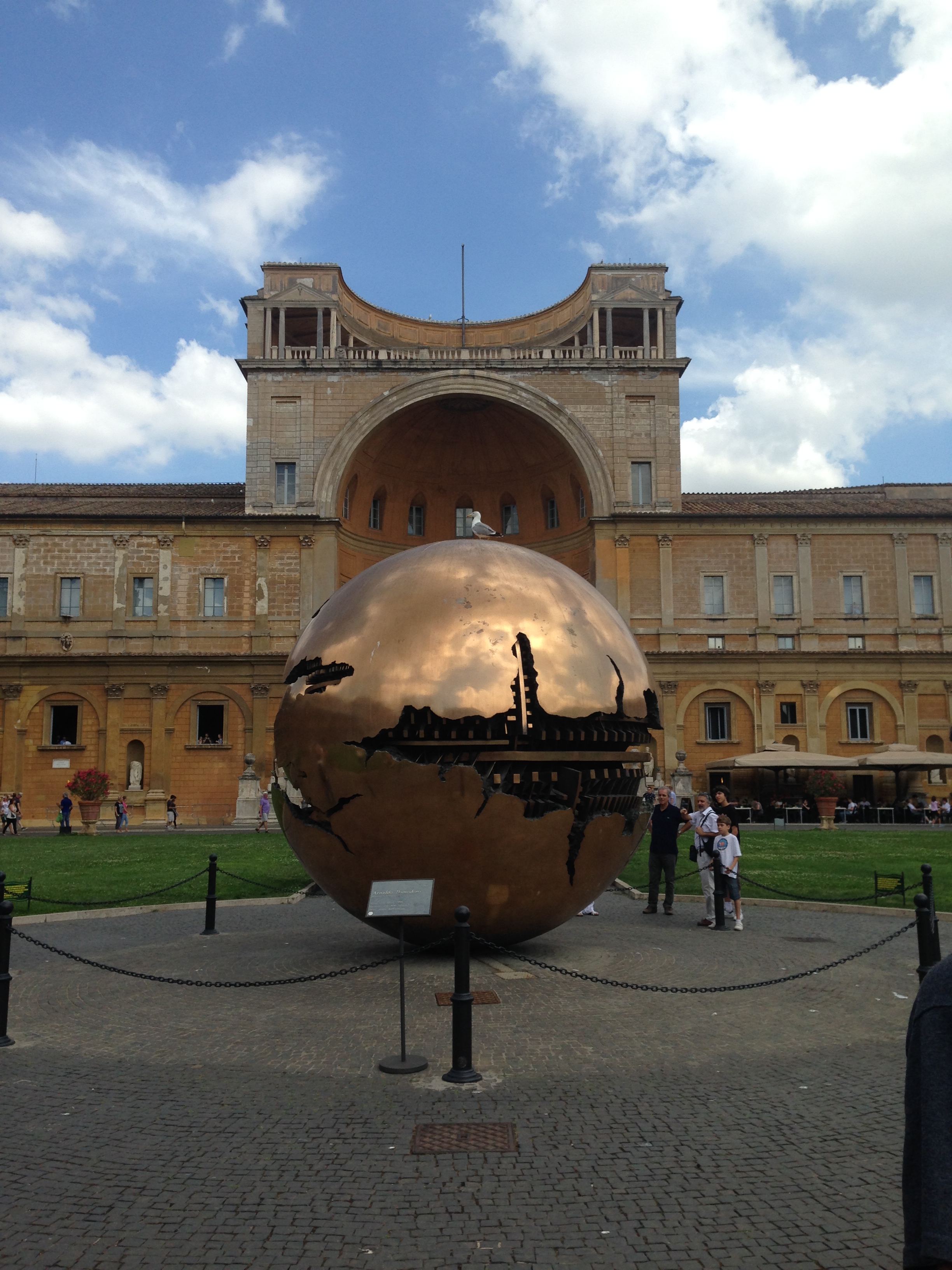 Sfera con Sfera, translated as Sphere within a Sphere, is a bronze statue that appears golden as the sun shines down on it.