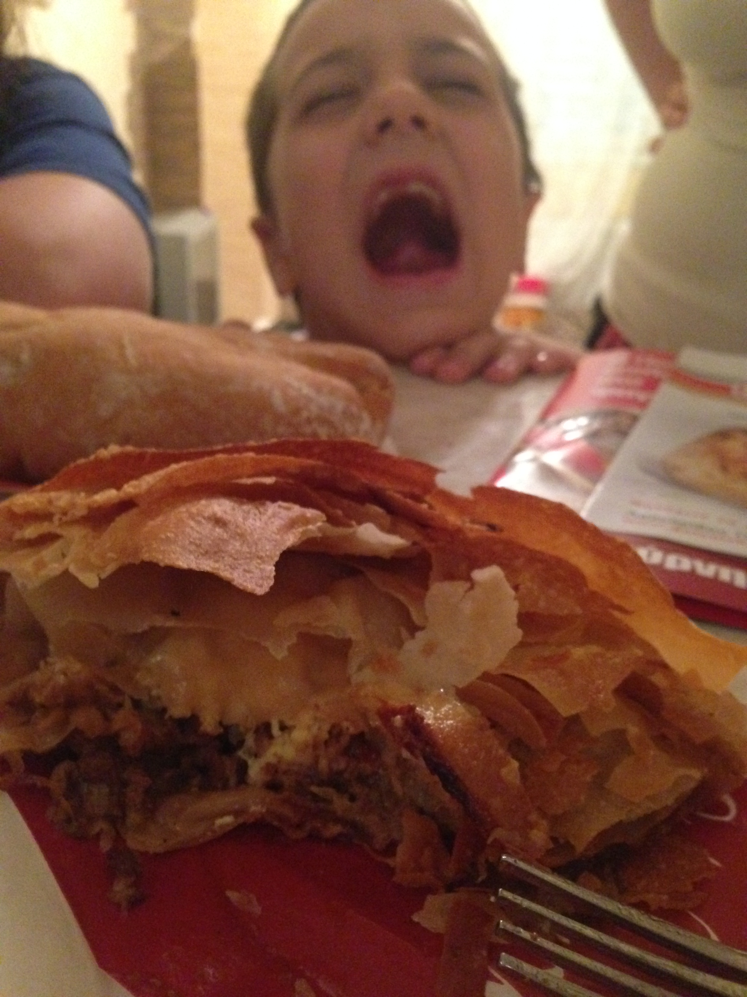 I want to remind you all that it was incredibly hot in Athens during our week there. We drank our weight in water every day that we went out and dealt with the younger ones complaints of death by sweating! But we made it….our days out were interspersed with touristy sights and walking through neighborhoods. We encountered the National Gardens which offered a lovely shady respite during one extraordinarily hot afternoon. And on our days spent doing school we searched out all the wonderful local foods we could find. My favorite was anything bourek. Bourek is a type of pastry made from phyllo dough and filled with anything from cheese and minced meat to veggies. The ones from the local coffee shop were filled with feta and I could have eaten them for a month. Plus they were cheap and filling 🙂