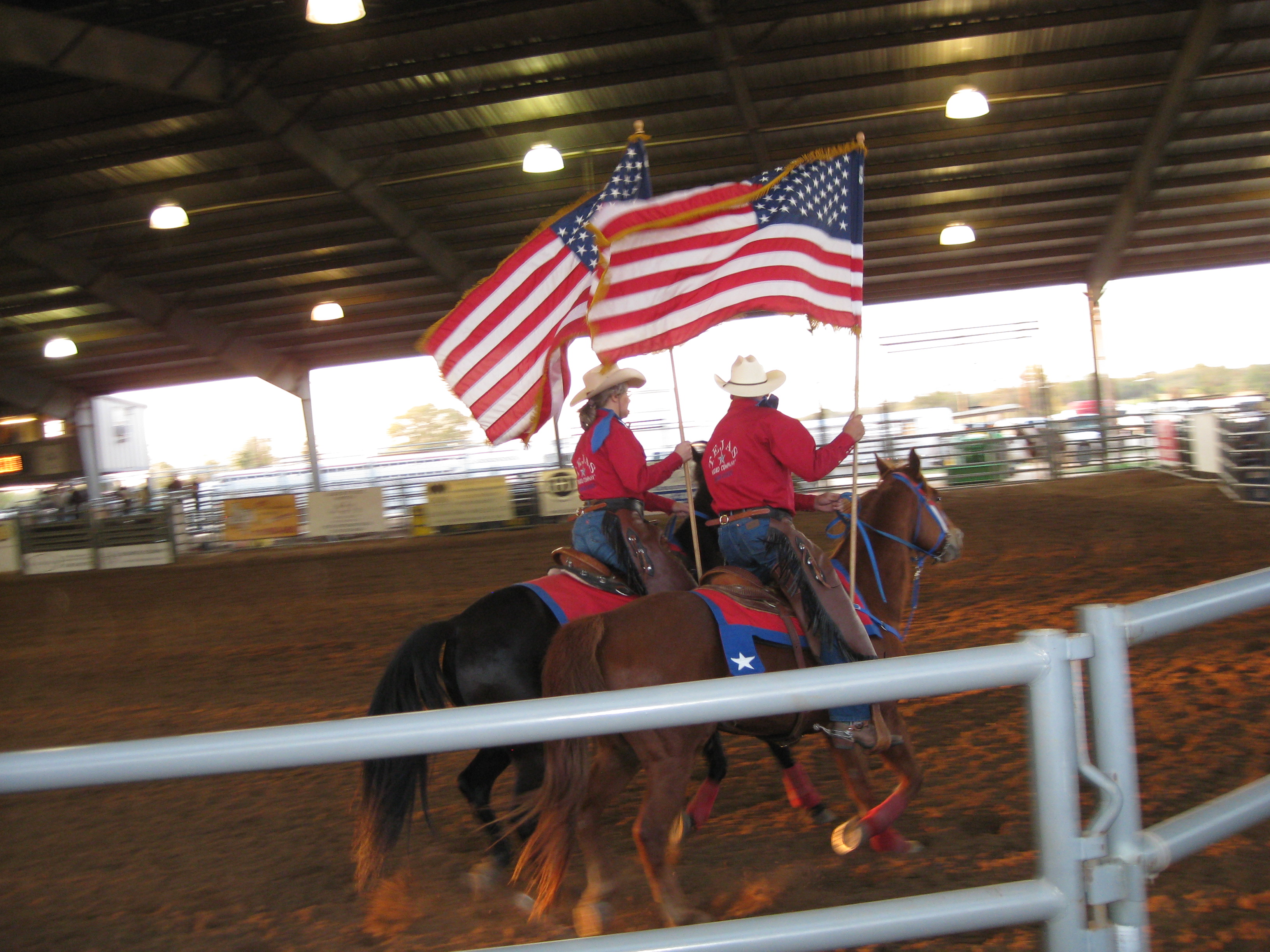 It was an interesting combination of farm, fair, and typical rodeo. There were vendors and food stands along with a mechanical bull (and NO I wouldn’t allow them to ride…you should have seen those kids getting whipped around!) and of course the rodeo arena with all the horses and bulls. We walked around a bit and then headed into the arena to see the preshow. Did any of you see that movie called Cowgirls ‘N Angels? Well, the pre-show was much like the group of female riders in that movie. We saw riders doing a few tricks and carrying flags. It was very emotional for me to witness the show of patriotism as the US flag flew and the anthem was sung. I seriously doubt anyone can say that God doesn’t live in Texas. It was amazing.