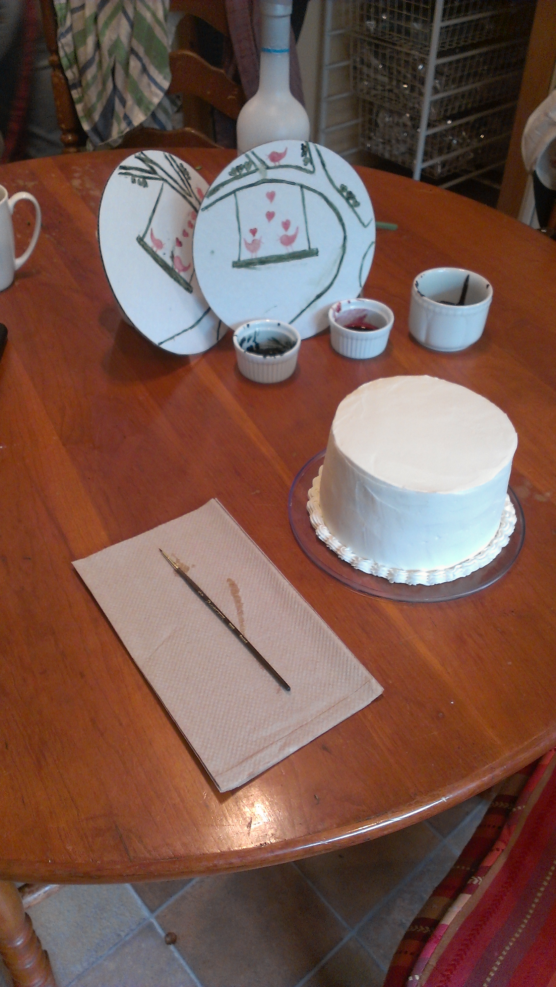 If any of you bake, you know that making a cake that doesn’t dry out and comes out tasting and looking good is hard enough. But if you add in the difficulty of making it gluten and sugar free, without a recipe, then you understand why I say I was daunted by the challenge! But, after months of trials, errors, and successes, I finally had it right and was proud of my efforts. I also figured out a way for Grace to be involved…she painted the top cake! I knew Puja would love it…she’s a lady who cherishes gifts from the heart 🙂 And this cake was such a labor of love for both Grace and me.