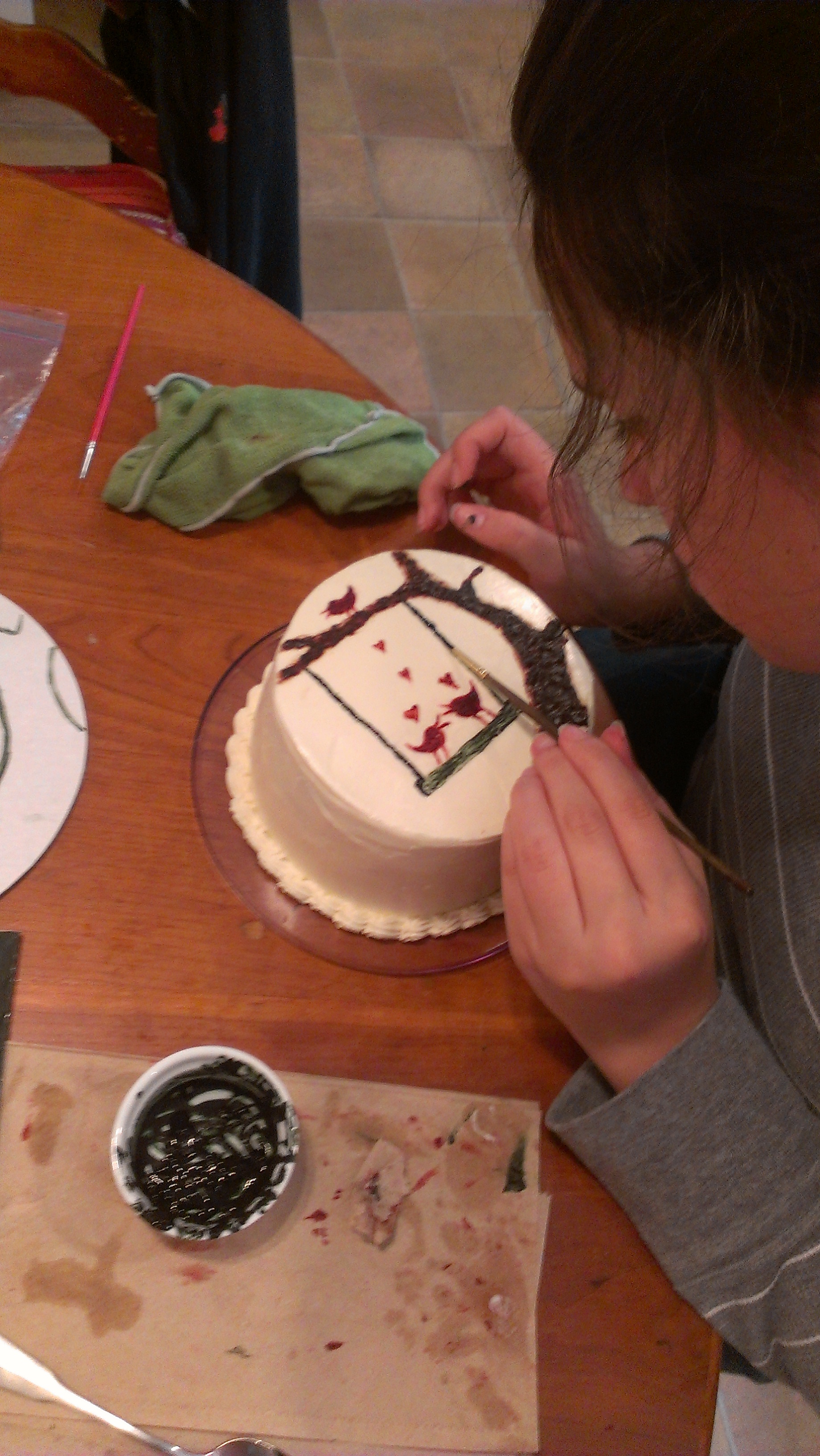 Here she is putting the final touches on the cake. We even made the colors out of healthy products. Dried vegetables and Mariah’s secret house chocolate mixed with vodka gave Grace her ”paint”!