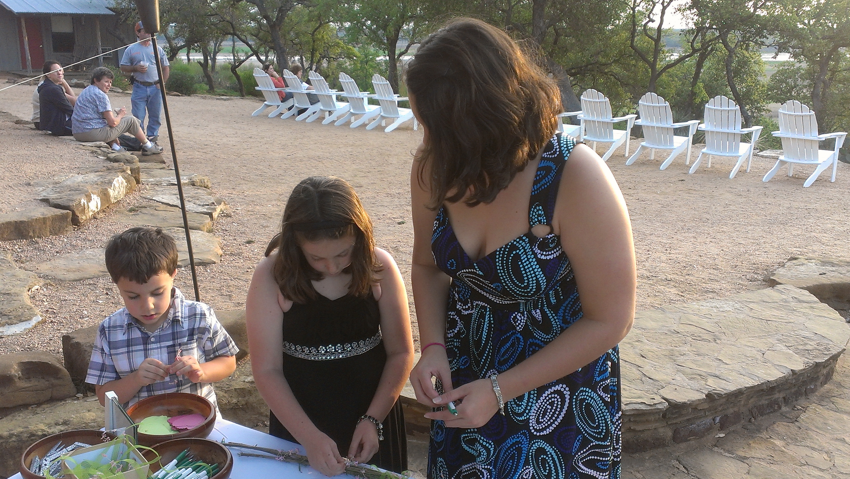 The festivities were taking place on Lake Buchanan just outside of Burnet, Tx. Her mom owns and runs Rainbow Hearth Sanctuary and Retreat which is where everything but the ceremony and reception took place. During the week leading up to the event, we spent every day there at the Hearth spending quality time with Mariah (Puja’s mom) and John and getting the feel for the kitchen so we could make the wedding cake! I absolutely love love love the Hearth. I can’t explain to you all how just being there affects my family. As we cross the property line, the little arrival sign welcomes us like long lost friends, inviting us to breathe deeper and let go of the stresses of our daily lives. In Mariah’s home, you find that you are hard pressed to look at a phone or a clock. The whole atmosphere at the Hearth encourages you to listen to your inner voice and enjoy simply existing in the present moment. And that’s what we do. We seem to relax in a way that allows us to truly be with each other. And that feeling persists for weeks after we leave.