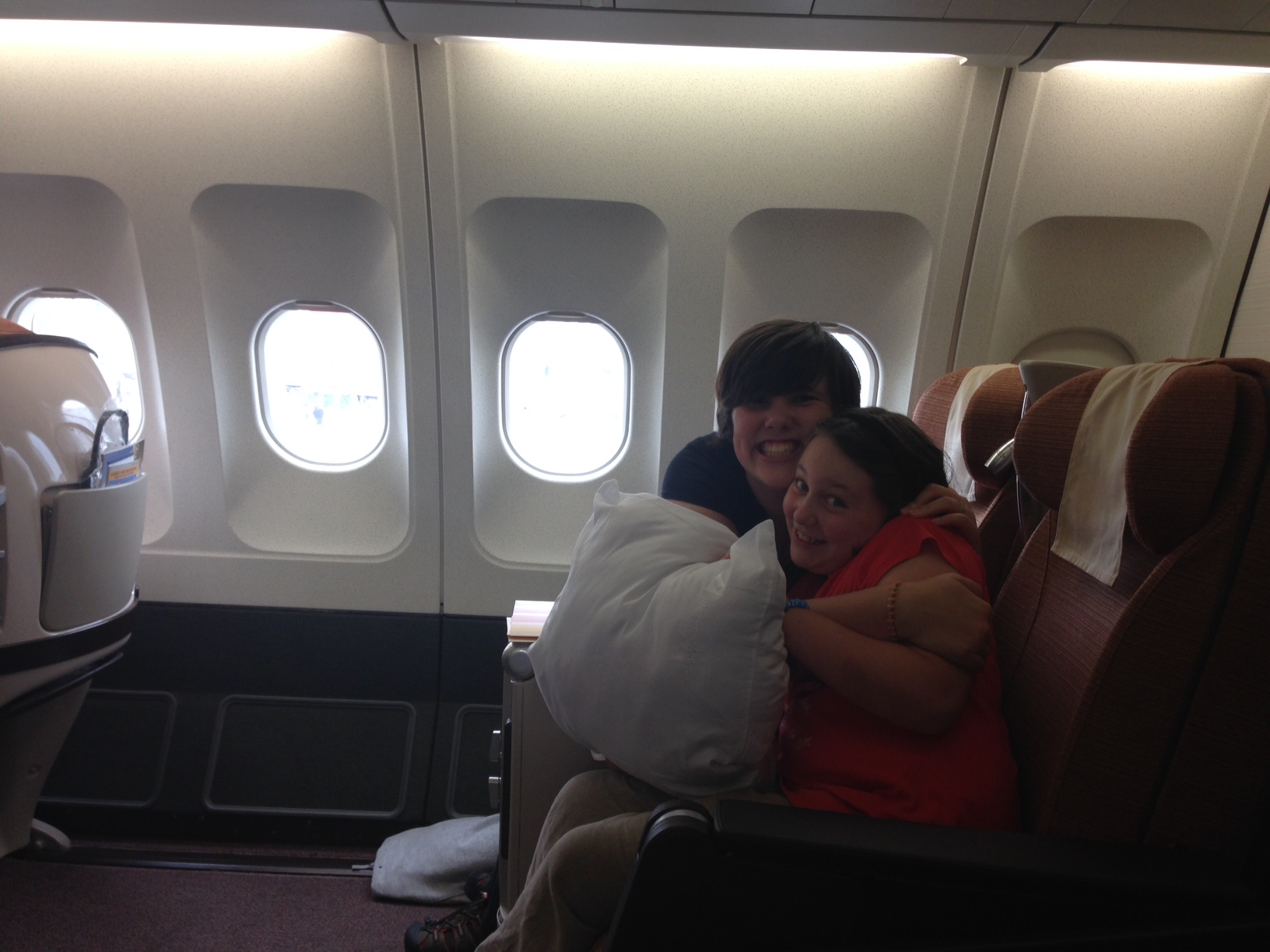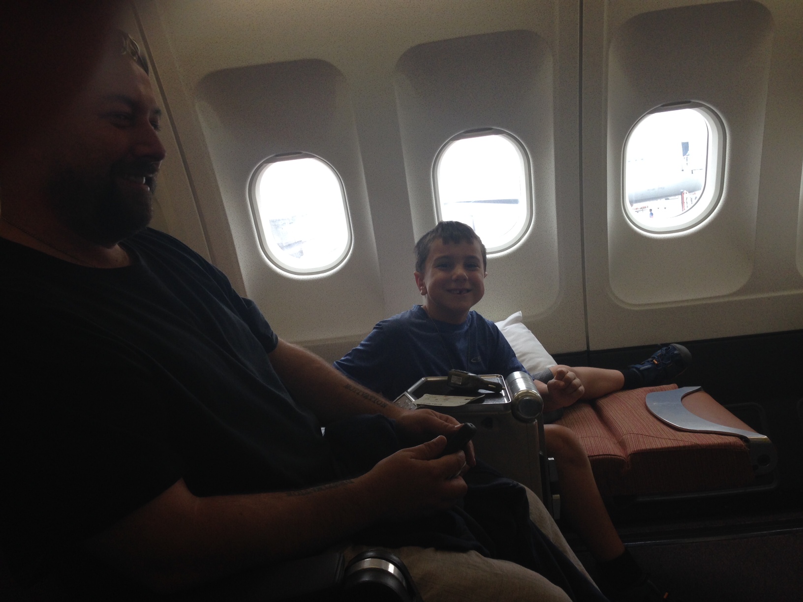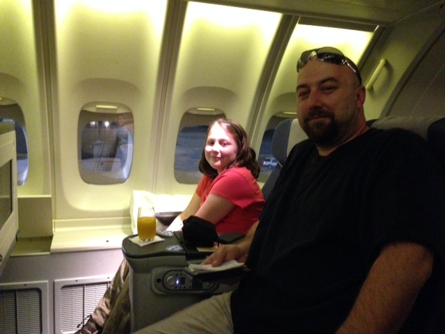 Then it was time for takeoff! again, business class seats for our 16 hour flight were definitely the way to go. It was broken into chunks. The first 5 hours took us toward Honolulu for a refuel plus a medical drop off and then another ten hours to Manila. We all slept a little before Honolulu and quite a bit on our way to Manila. The business class seats recline to a very nice almost flat position. That plus the extra leg room, vast movie selection, and great service really made the trip seem almost easy 🙂